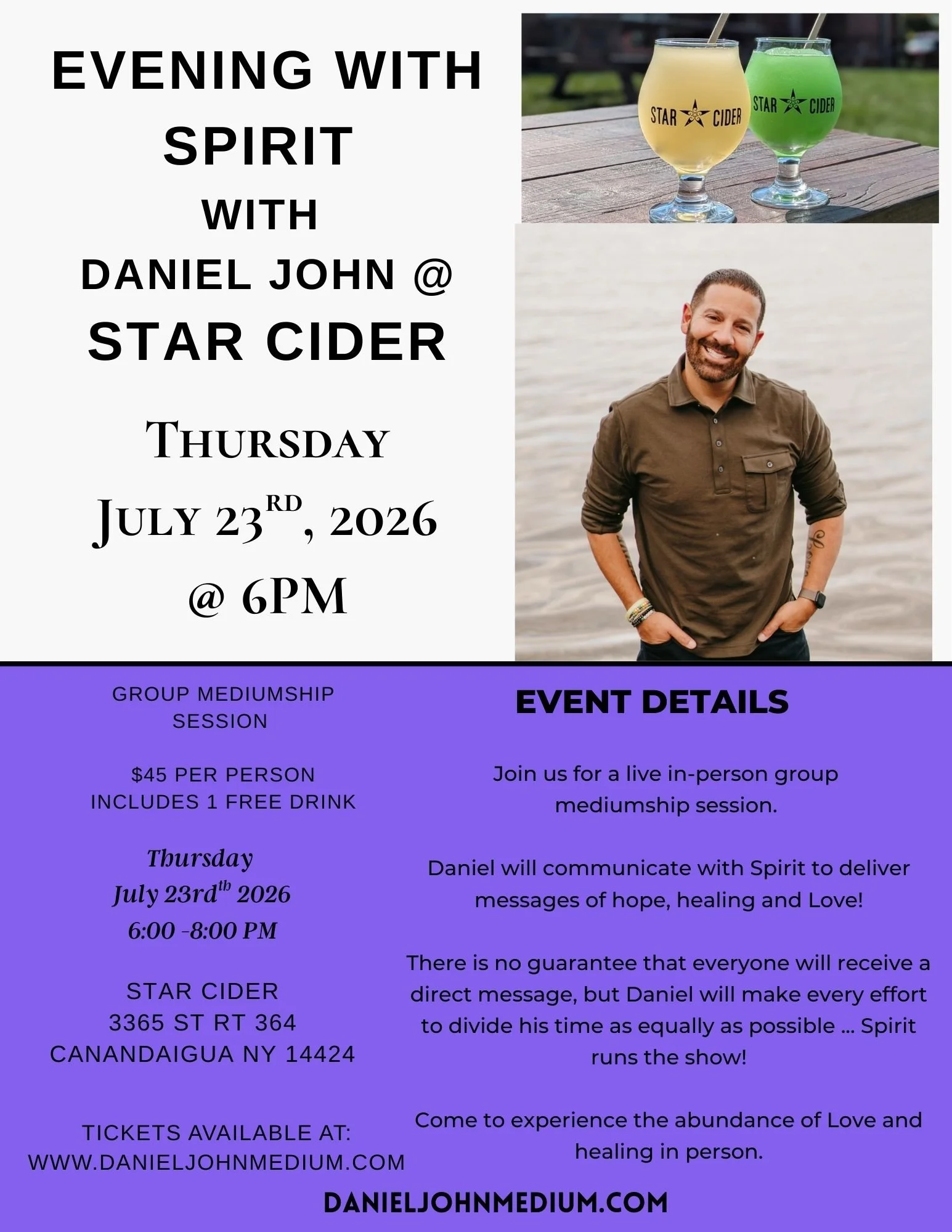 About group events: Live in person group sessions are held in a warm and intimate atmosphere where Daniel will communicate with Spirit to deliver messages for everyone’s highest good. There is no guarantee that everyone will receive a message, but we have limited seats, so that most people will not only receive a message, but they will also be able to witness healing in an intimate setting, thereby healing themselves.Daniel will make every effort to divide his time as equally as possible, but Spirit runs the show! Daniel cannot guarantee that you will hear from the particular person you would like to connect to, but you can be certain that the messages that are delivered, are meant to be so.Please be aware that a group session will not only bring messages forward from the “other side”, it will also help the audience understand a little more about life, mediumship and the metaphysical. The session will run approximately 90-120 minutes. Please bring a pad and pen to take your own notes if you wish, as no recording is allowed at these sessions in respect of everyone's privacy. You’re encouraged to arrive early. We will laugh, cry, experience compassion, spread Love and heal! Come join us!